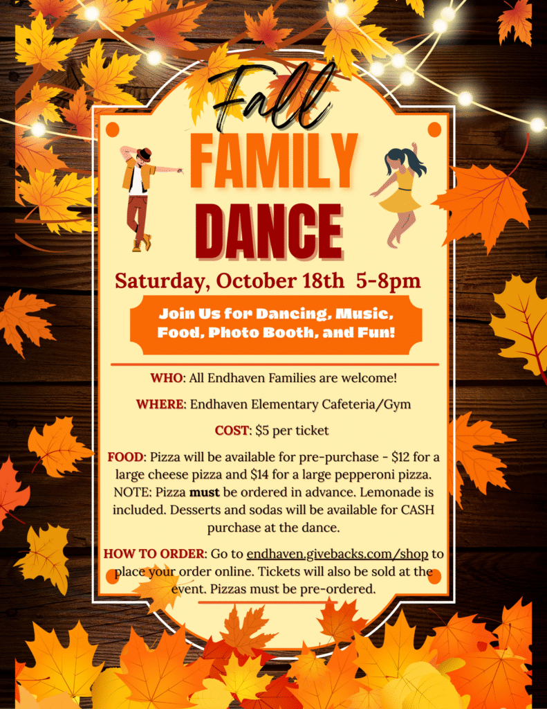 Our Endhaven Family Dance is Fall themed this year! It will take place in our school gym/cafeteria on Saturday, October 18th from 5-8 pm. Please see details on the flyer below. Pizzas MUST be pre-ordered using the Givebacks site linked HERE: https://endhaven.givebacks.com/shop. We hope to see you there!